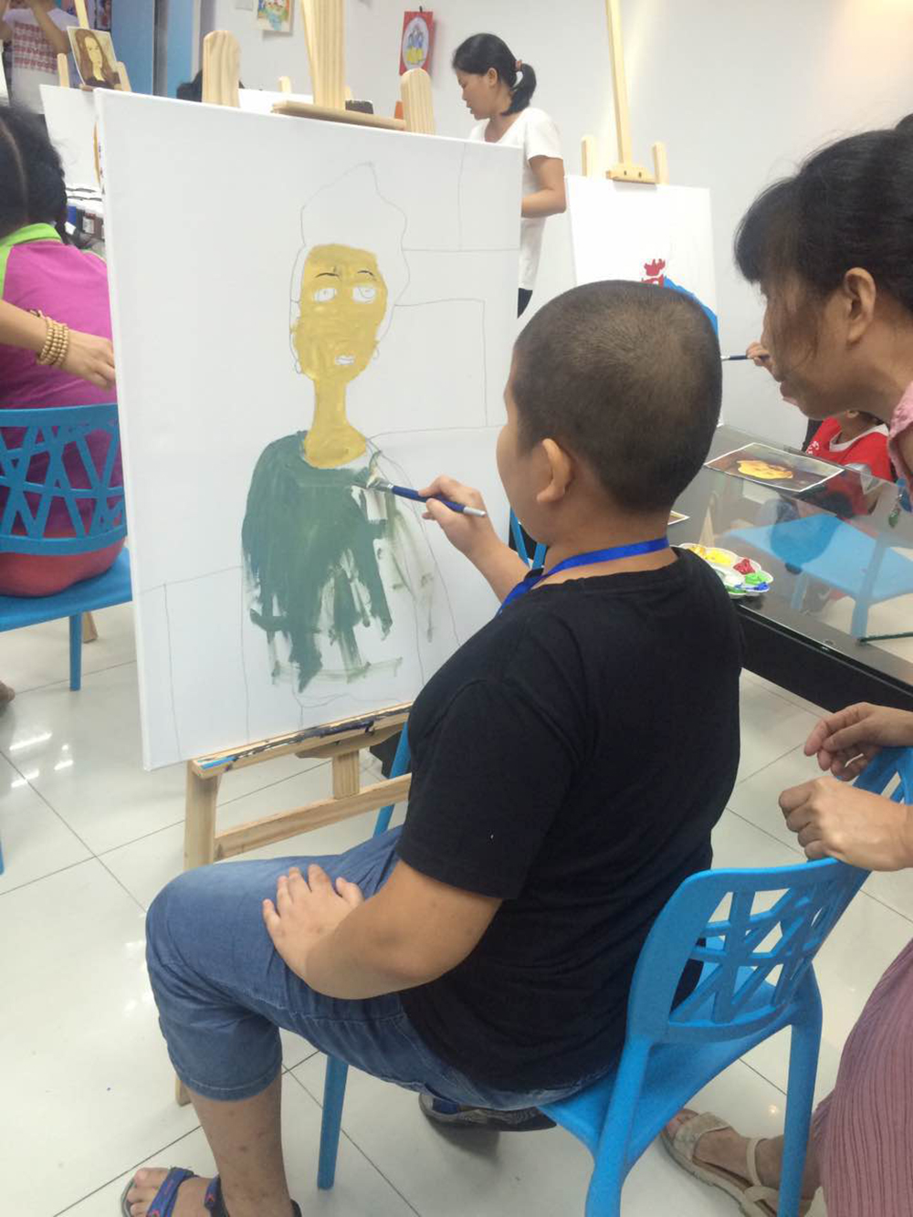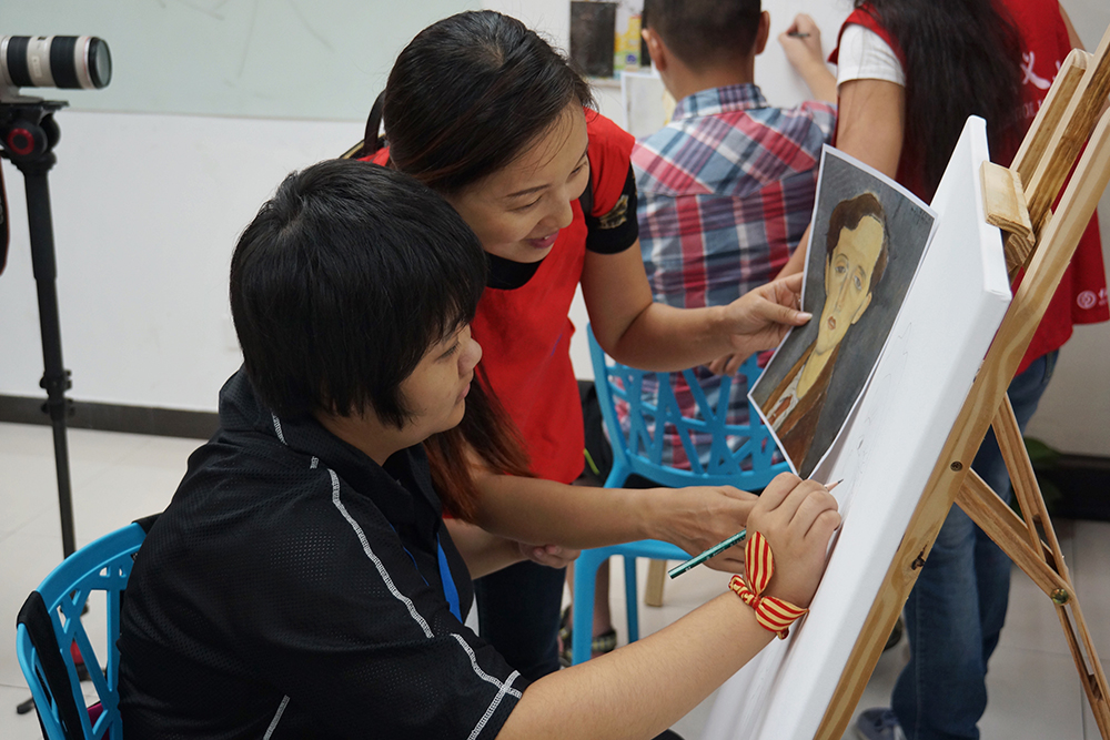 開課當天,自閉癥兒童在義工的陪伴下,跟著繪畫老師學會畫筆,到慢慢完成繪畫課,他們的注意力很專注,對色彩有特別的偏愛,整個繪畫課程簡單有趣,加上義工的耐心陪伴,讓畫室洋溢著一種溫馨有愛的氣息。